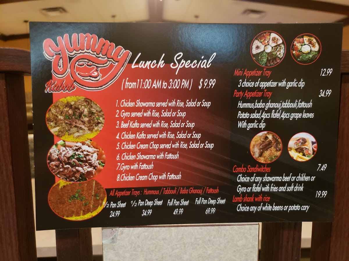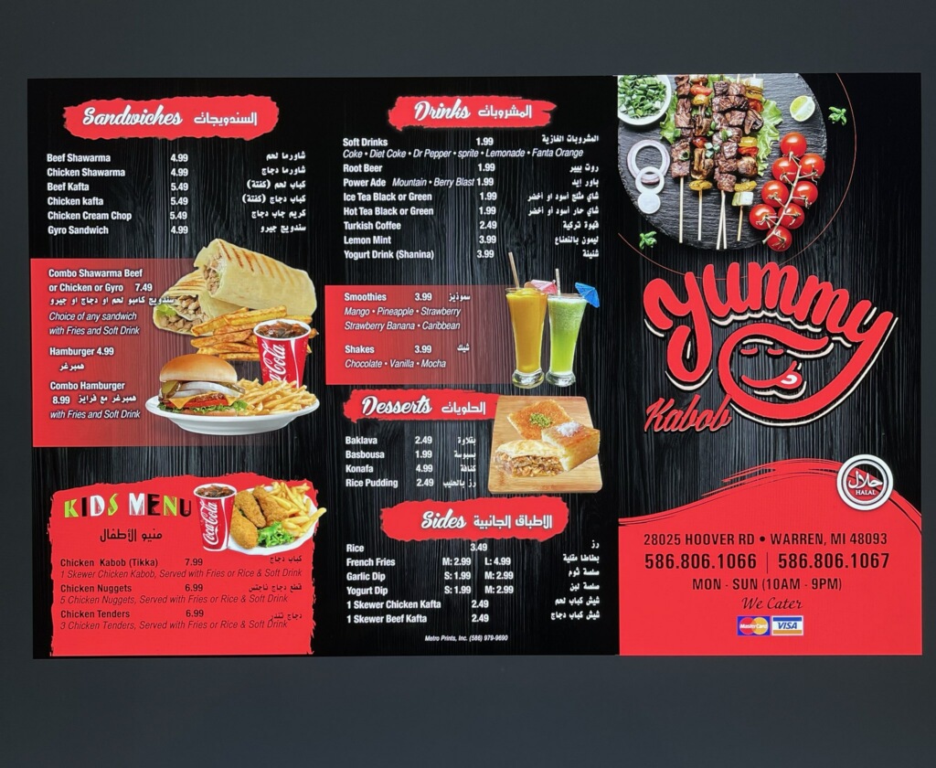 At Yummy Kabob in Warren, MI, the menu impresses with its range and authenticity, appealing to both traditional Middle Eastern cuisine lovers and those seeking familiar comfort foods. The sandwiches lineup features favorites like the Gyro Sandwich, Beef Kofta Sandwich, Combo Shawarma Gyro Hamburger, and Beef Shawarma Sandwich, each promising generous portions. For younger diners, the Kids' Menu offers Chicken Nuggets, Chicken Tenders, and Chicken Kabob. Starters are abundant, from Fried Kibbeh and Tzatziki to Veggie Grape Leaves, Hummus With Meat, and Oregano With Feta Cheese, providing a flavorful prelude to the main courses. Soups and salads, such as Chicken Lemon Rice Soup, Potato Salad, Tabbouli Salad, Fattoush Salad, and Greek Salad, balance the menu with fresh, vibrant options. The entrées stand out with dishes like Shawarma Mix Gyro And Chicken, Vegetarian Plate, Vegetarian Sham Quzi, Lamb Chops, and the Gyro Plate, each complemented by sides like Skewer Chicken Kafta, Rice, Skewer Beef Kafta, Garlic Dip, and French Fries. Dessert enthusiasts can indulge in Rice Pudding, Baklava, Konafa, and Basbousa, while the beverage selection ranges from Turkish Coffee and Ice Tea Black to Soft Drinks, Smoothies, and Root Beer. The salad plates-including House Salad With Cream Chop Plate, House Salad With Gyro And Tzatziki Plate, House Salad With Chicken Shawarma Plate, House Salad With Beef Shawarma Plate, and House Salad With Beef Kafta Kabob Plate-offer a satisfying combination of freshness and protein, rounding out a menu that successfully balances variety, flavor, and traditional appeal.